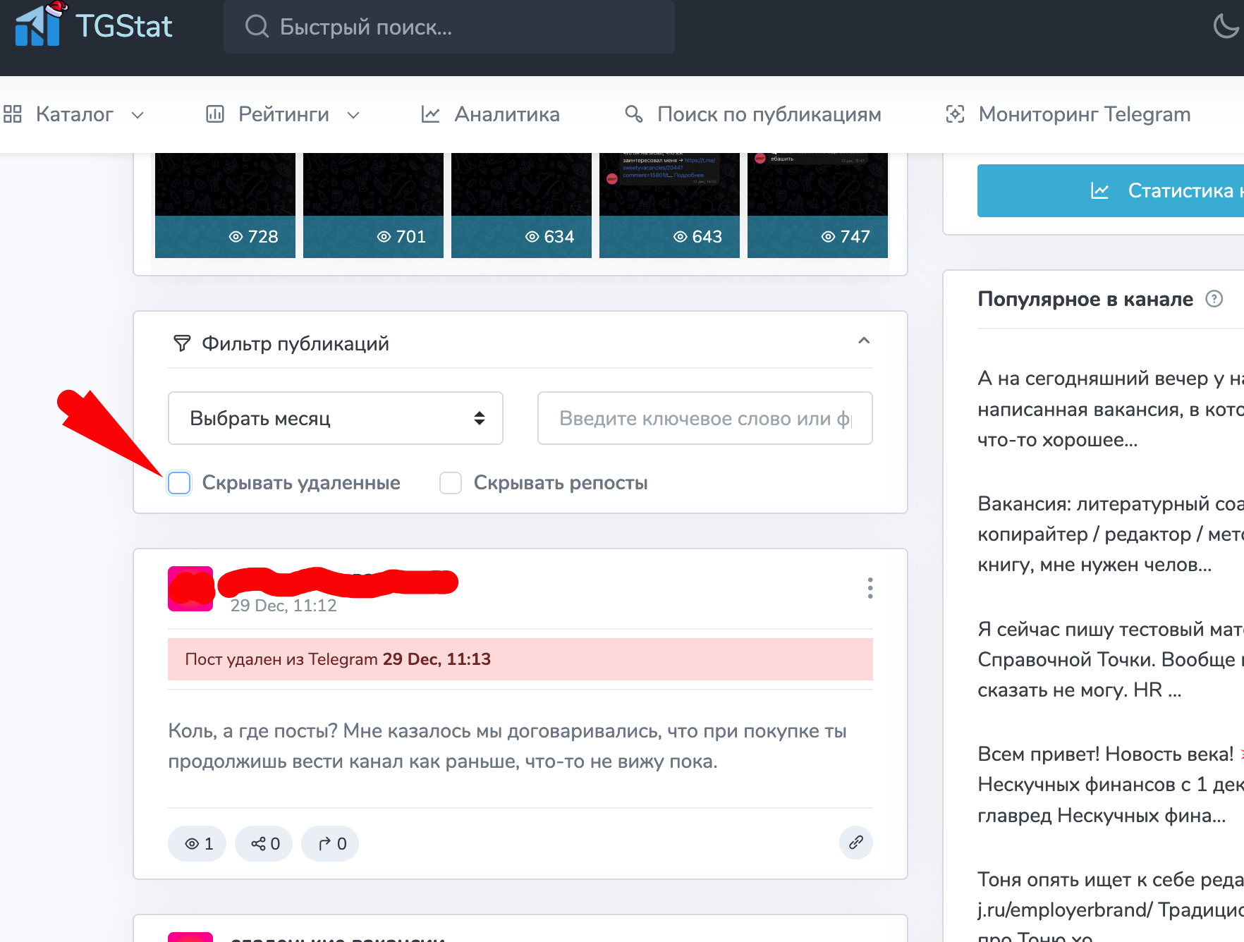Речь про сервис TGStat, который агрегирует статистику каналов и сохраняет публикации, включая удалённые.