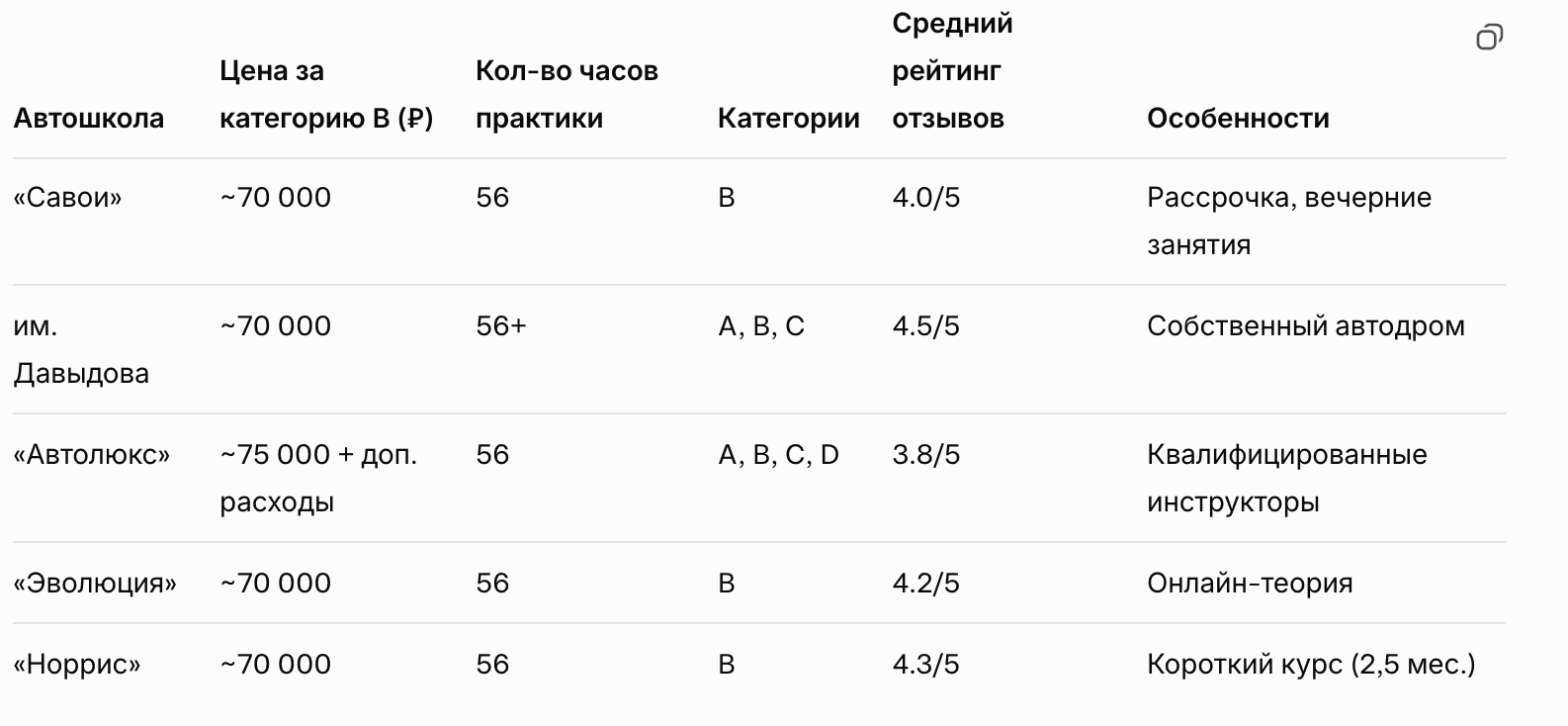 Если ориентироваться на качество обучения и отзывы учеников, то в более выгодном свете выглядят автошкола «Норрис», хорошая репутация, накопленная за годы работы, и тёплое отношение к ученикам. «Автолюкс» отличается широкой линейкой категорий и большим количеством практики, но вызывает вопросы из-за отзывов и отношения к клиентам. «Эволюция» выигрывает за счёт рассрочки и современного формата обучения, но ограничивается только категорией B и неудобным графиком. «Савои» остаётся самым спорным вариантом: несмотря на удобное расположение и вечерние занятия, негативные отклики портят общую картину.