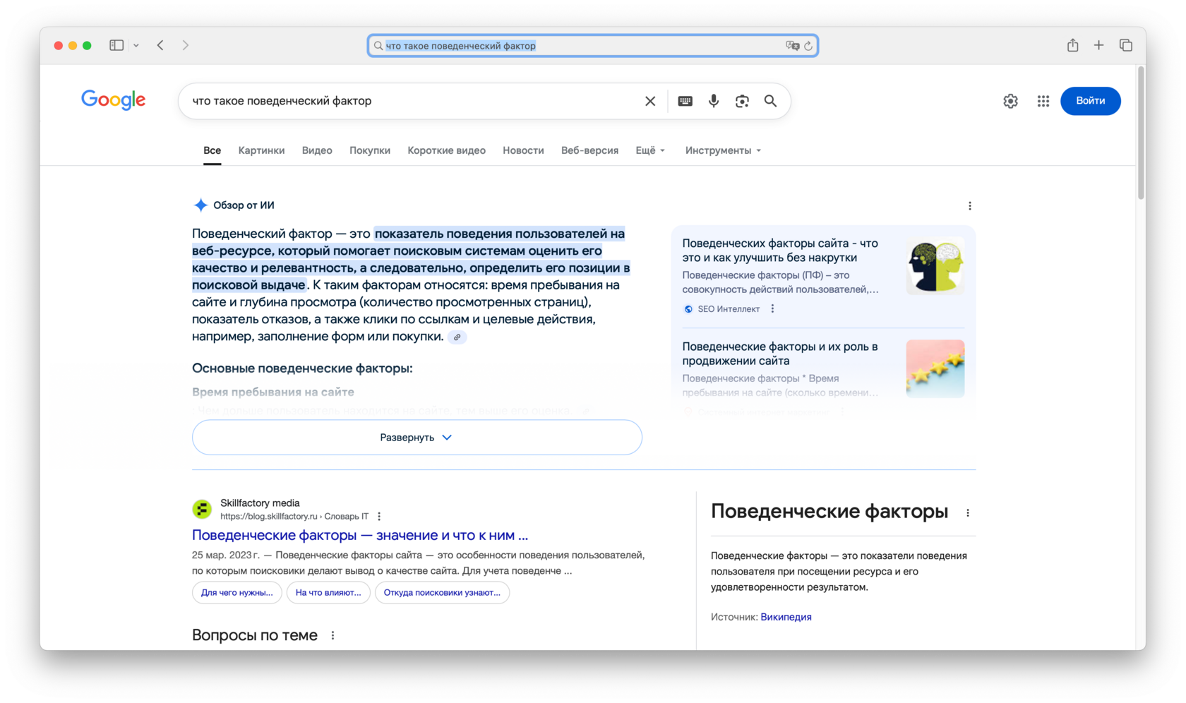 ПФ (поведенческие факторы) — это показатели, по которым поисковики оценивают полезность сайта для пользователей. К ним относятся CTR сниппета, время на сайте, глубина просмотра и возвраты посетителей.