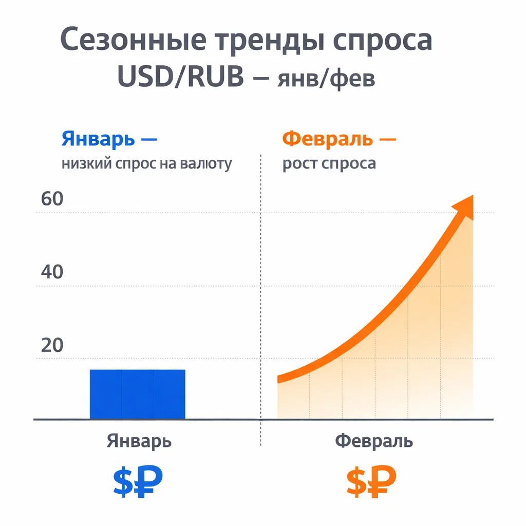 Февраль исторически — месяц повышенной активности. Корпоративные хеджеры закрывают форварды, начинаются расчёты по внешнеторговым обязательствам. Что будет с рублём в феврале означает давление на спрос валюты, что может временно поднять курс в диапазон 130–133 ₽. Официальные публикации могут оставаться ниже реального уровня за счёт аккуратной монетарной политики ЦБ.