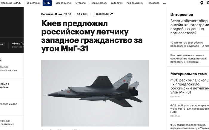 ФСБ заявила, что украинская разведка при участии британских кураторов пыталась провернуть операцию по угону российского истребителя МиГ-31, оснащённого ракетой «Кинжал».