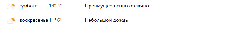 Суббота, 18 октября. Ожидается преимущественно облачная погода. Максимальная температура около 14 °C, ночью — до 4 °C. Удобное время для прогулок, особенно днём — тепло, хотя ощущение прохлады будет чувствоваться.