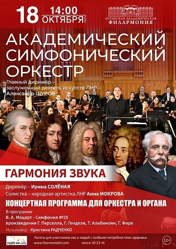 18 октября, 14:00, Большой зал филармонии — концерт «Гармония звука». В программе — исполнение популярных классических произведений камерным (струнным) ансамблем с дополнением органа: «Канон» И. Пахельбеля, трагические интерпретации Альбинони, вариации Генделя и Перселла, солирующая скрипка и орган.