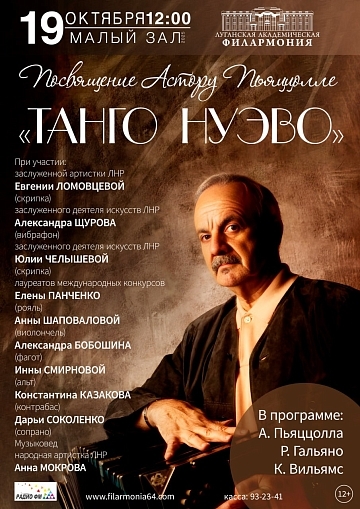 9 октября, 12:00, Малый зал Луганской филармонии — «Танго Нуэво»: музыка Пьяццоллы, Гальяно, Вильямса — чувственная программа, способная даже одного слушателя втянуть в мир страсти и звука.