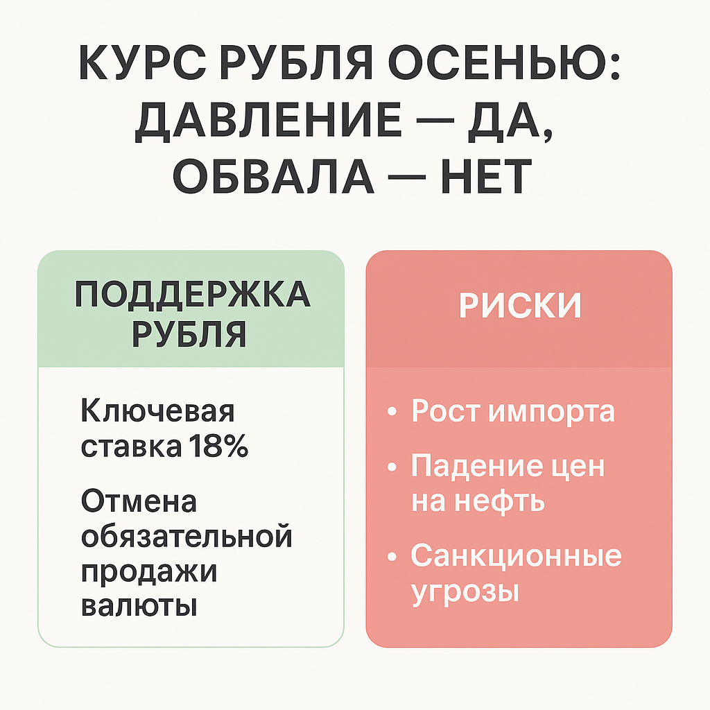 Кроме того, осенний рост импорта, возможное падение цен на нефть (давление со стороны ОПЕК+ и торговых войн), а также политическая неопределённость вокруг переговоров России с Украиной и санкционных угроз со стороны Запада остаются значимыми внешними рисками для рубля.