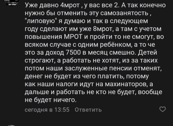 Да и пенсии не потому под угрозой, что кто-то в такси работает как самозанятый. А потому что наверху деньги растворяются в «махинациях». Делить людей на «настоящих работников» и «липовых» – тупо.