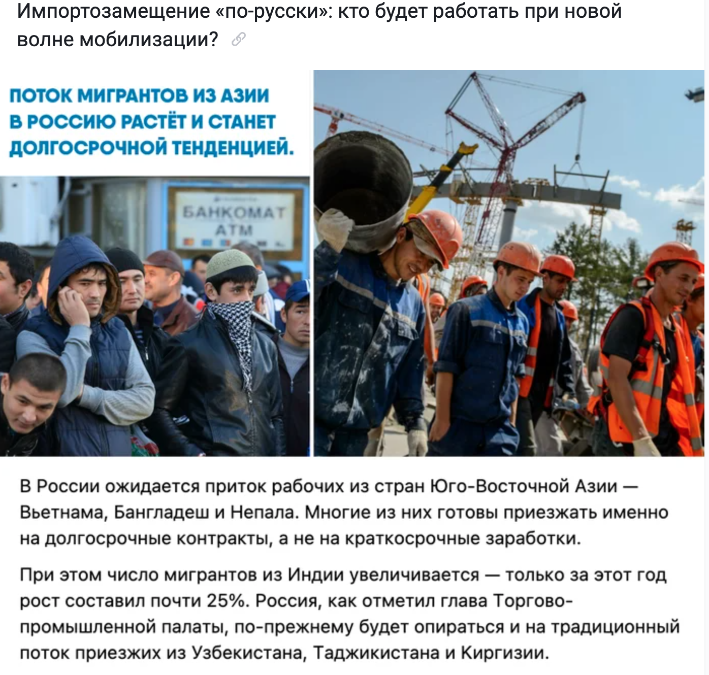 → Мобилизация больше не выглядит катастрофой. Когда первую волну проводили, работодатели чуть ли не волосы рвали: «Кто работать будет?» Теперь ответ простой: «Привезём». То есть армия и экономика перестают конкурировать за одних и тех же людей. Государство как бы разводит потоки: граждане идут на фронт, мигранты — на стройки.
