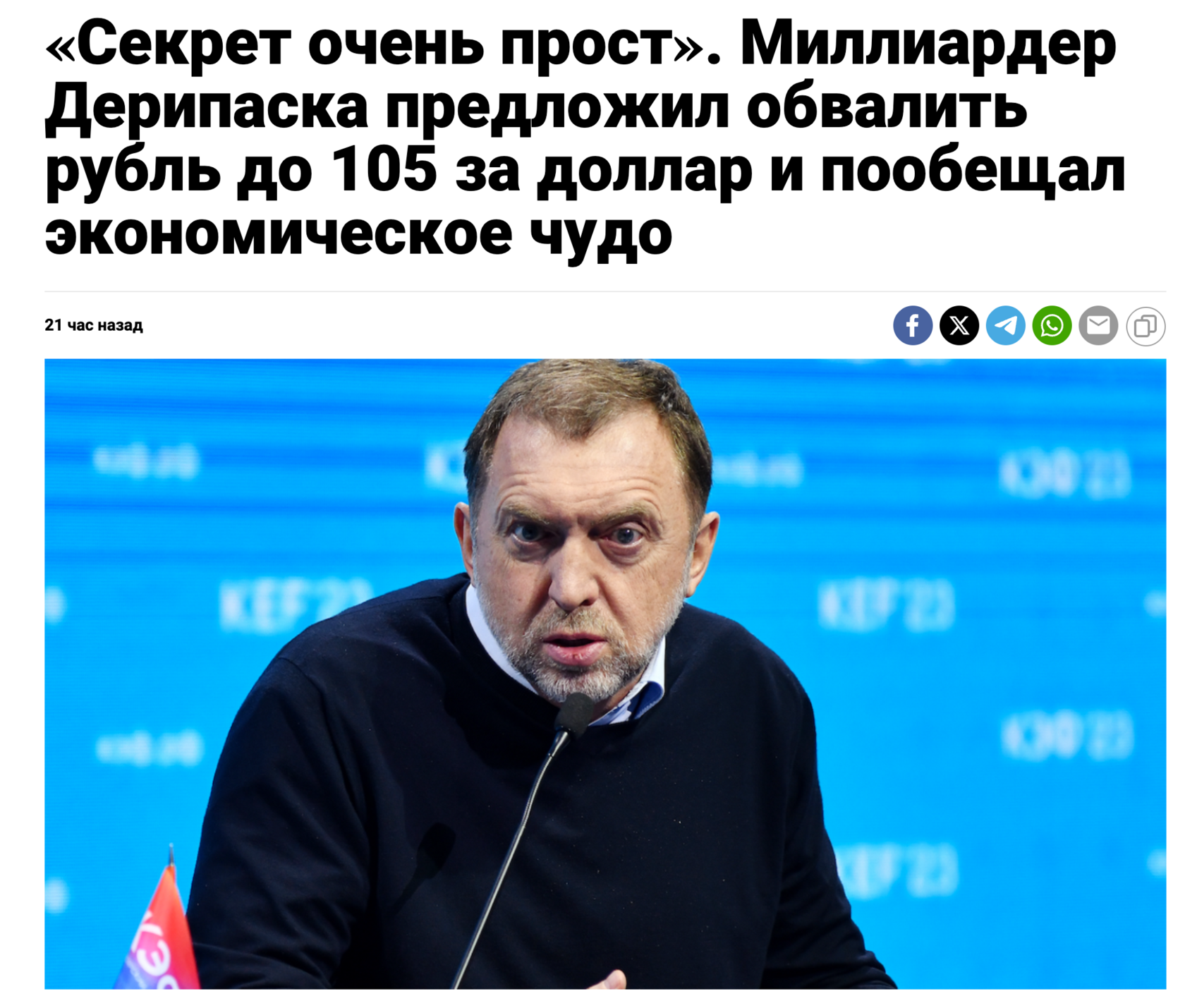 Миллиардер Олег Дерипаска предложил довести курс рубля до 105 за доллар, назвав это «простым секретом» для ускорения экономического роста.