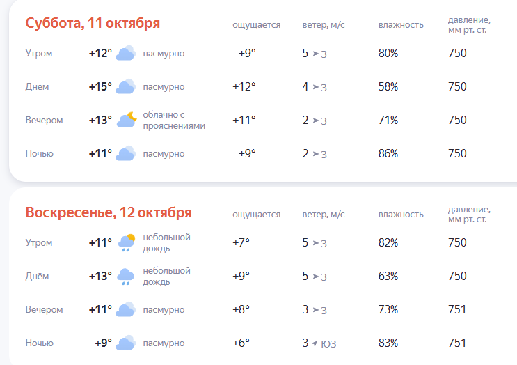 - 11 октября — днём до +15 °C, солнечно, без осадков.