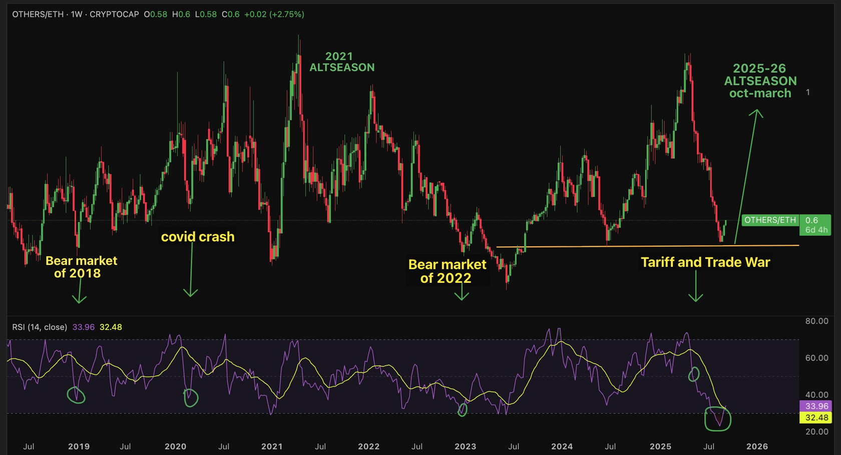 Трейдер Ash Crypto ещё увереннее: альткоины якобы находятся в наиболее перепроданной зоне за всю историю. Он прогнозирует настоящий альтсезон: от дна цена подскочит в 10–50 раз за 3–4 месяца, с ротацией ликвидности от Bitcoin к ETH, а затем к остальным альтовым активам.
