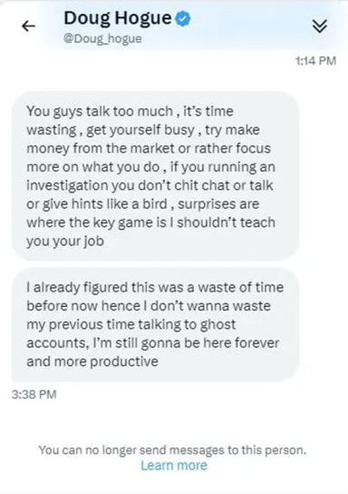 История «Дага Хоуга» — псевдонима, под которым скрывается очередной интернет-аферист, — показательна. Его жертвами становятся участники Twitter-сообществ, обсуждающих так называемые мемные акции. «Даг» появляется в аудиокомнатах, представляется экспертом и предлагает подписчикам выгодную стратегию: нужно всего лишь доверить деньги его «партнёрской» платформе Spark Fusion. Дальше сценарий всегда одинаковый: инвестор переводит средства, получает фальшивые отчёты о «торговле», а через несколько дней его счёт блокируют, требуя новые пополнения. Вскоре доступ окончательно исчезает, а вместе с ним и сам «Даг».