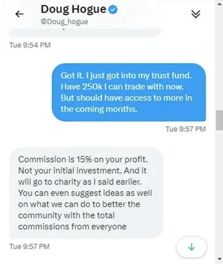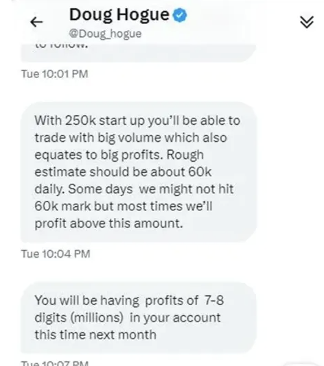 Даже в разговоре с журналистом Forbes «Даг» продолжал играть роль «успешного трейдера». Он предлагал вложить $250 тысяч, обещая превратить их в миллион всего за месяц, и уверял, что его комиссия уходит на благотворительность. Когда стало ясно, что собеседник готовит расследование, мошенник лишь вяло отмахнулся: «Займитесь делом, рынок всегда полон неожиданностей».